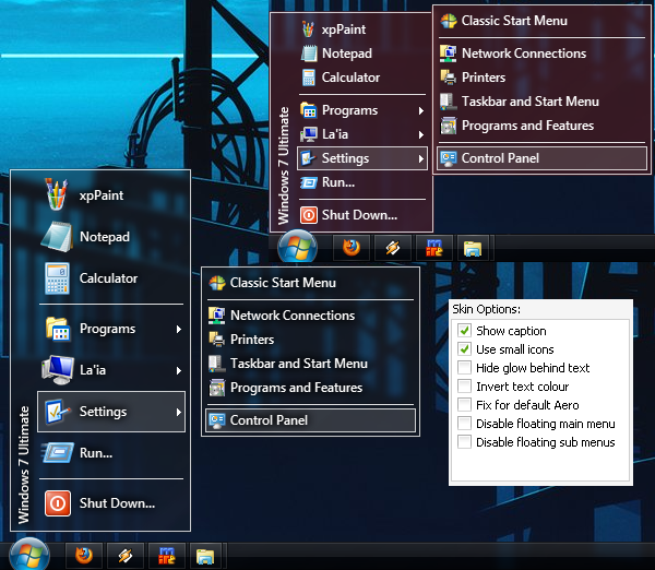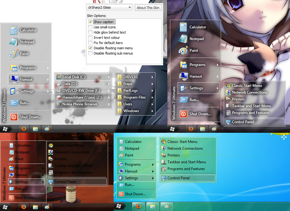 ClrSharp2 Glass is my second skin for Classic Shell, made to show the new FullGlass opacity mode added in Classic Shell 1.9.0. It also has the new skin options mode, adding lots of different customization options. The full glass mode also adds glassed submenus, and the colour of the whole skin changes based on the colour of your windows aero.